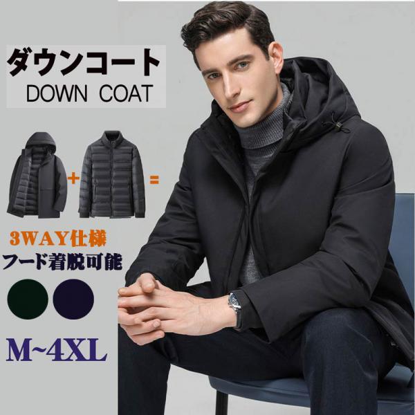 ダウンコートメンズ3WAYダウンジャケットフード付き脱着式ライナービジネスコート軽量ロングダウンコートメンズビジネス大きいサイズ父の日お父さん防寒防風高品質暖かい通勤ブラックネイビーc0x1