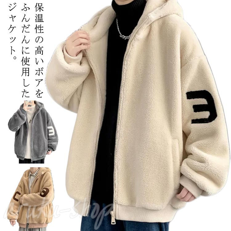もこもこ メンズ フリースジャケット フード付き ボアジャケット ゆったり 冬 冬 防寒 厚手 アウター ボアブルゾン ジャンパー ボアコート
