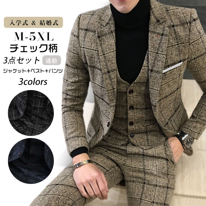 メンズ スーツ フォーマルスーツ 3点セット 3ピース ビジネス セットアップ ジャケット パンツ ベスト チェック柄 秋冬 厚手 父の日 大きいサイズ おしゃれ 入学式 礼服 結婚式 通勤