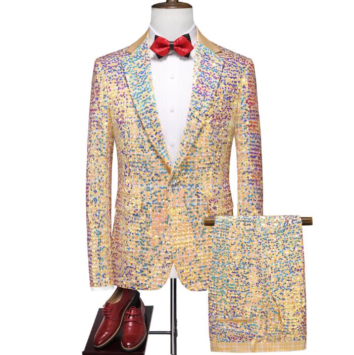 キラキラ メンズ舞台スーツセット テーラードジャケット+パンツ2点セット 注目 スパンコールカラオケジャケットステージ衣装