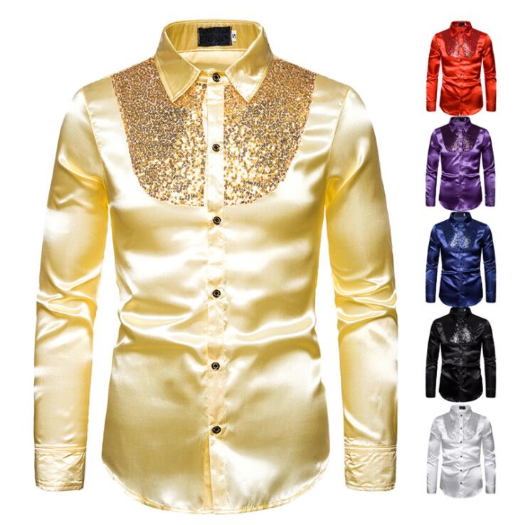 サテンシャツ メンズシャツ ワイシャツ 長袖 スタンドカラー スパンコール カラバリシャツ ダンス衣装 舞台衣裳 ステージ衣装 舞台衣装 光沢 忘年会 新年会 余興 団体服 礼服 写真撮影 パ 司会者