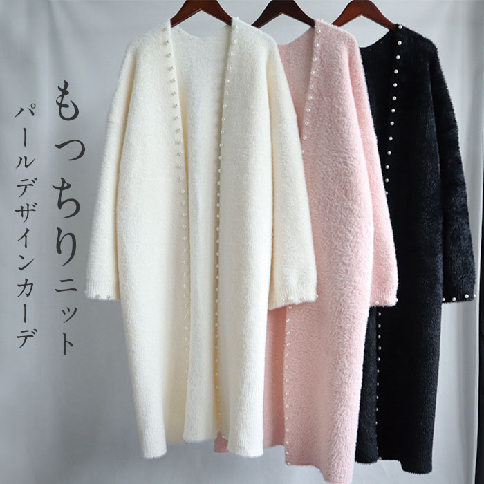 ★パールデザイン ロングカーディガン シャギー ニット 厚手 レディース コーディガン 無地 きれいめ ボタンなし ゆったり 長袖 春秋 オフィス 羽織もの ライトアウター