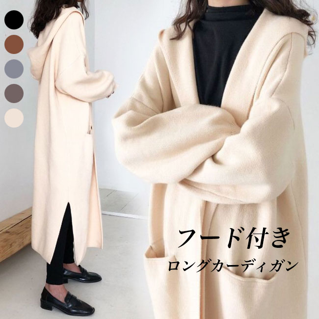 ニットカーディガン ロング レディース カーディガン フード有り ロングカーディガン ドロップショルダー 大きいポケット カーデ ノーボタン ニット カジュアル ボタンなし フード付きカ コーディガン