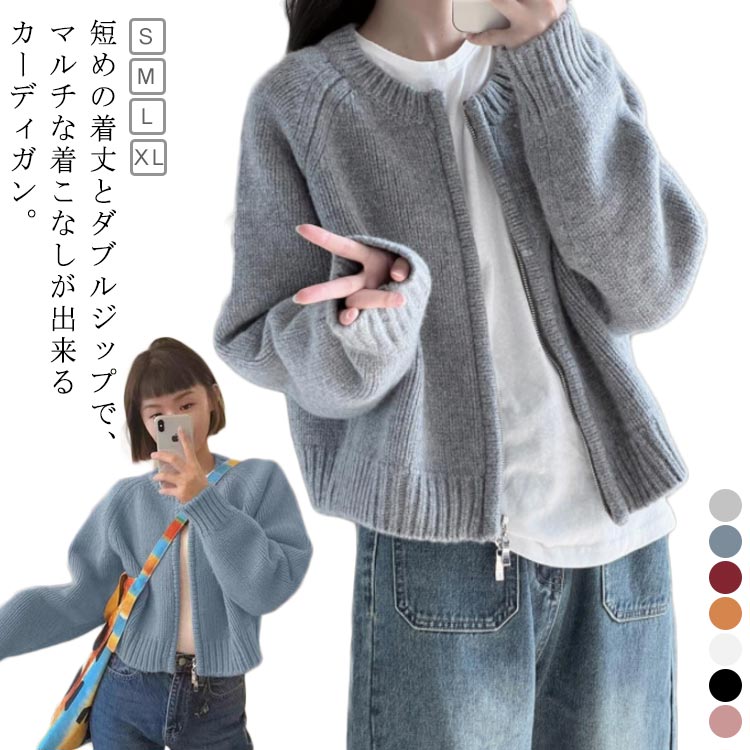 ニットカーディガン レディース 長袖 ニットセーター 秋冬 短め トップス アウター ラウンドネック 前開き 羽織り 体型カバー 厚手 ファスナー ダブルジップ ショート 防寒 カジュアル ゆ 暖かい