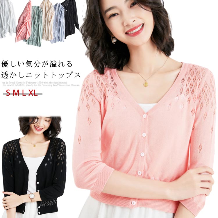 ニットカーディガン 涼しい ニット 夏用 薄手 七分袖 レディース サマーカーディガン トップス 夏 オフィス 日焼け止め 羽織り 半袖UV対策 冷房対策 カジュアル 体型カバー 6co はおり