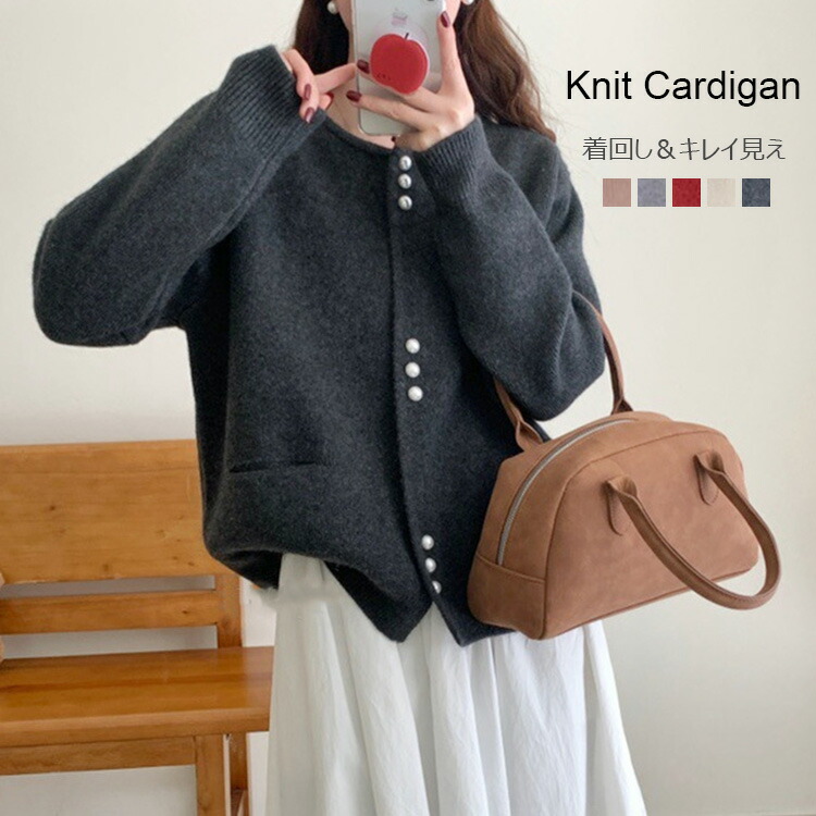 ニット カーディガン レディース 春 秋 冬 羽織り ショートニット トップス 羽織 長袖 ニットカーデ アウター ゆったり ミディアム丈 中厚手 無地 シンプル クルーネック 防寒 大人 前 伸縮性