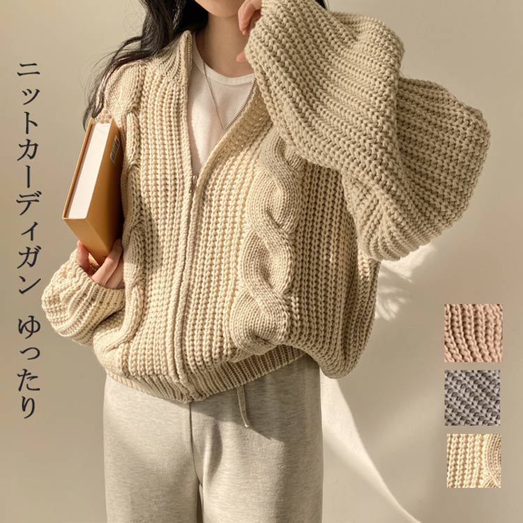 ニット カーディガン レディース 秋冬 ニットカーディガン 長袖 ショート丈 ゲーブル編み ファスナー 前開き 無地 トップス 羽織り ニットセーター 柔らかい セーター 暖かい ショート カジュアル