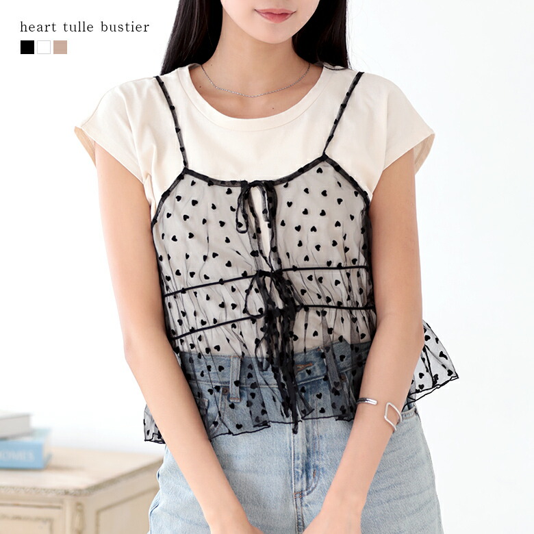 2A49 チュール ビスチェ キャミソール ハート柄 リボン トップス レディース 韓国ファッション フレア
