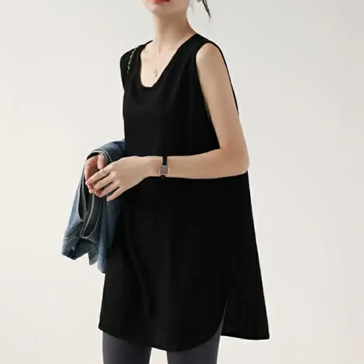 ラウンドネック サイドスリット ロングタンクトップ カジュアル 重ね着 トレンド 着回し