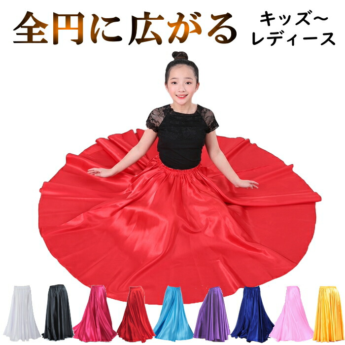 ダンス 衣装 赤 スカート 360 全円 ロングスカート 光沢 サテン フレアスカート レディース キッズ 子供 カラオケ衣装 コーラス 社交ダンス ステージ衣装 派手 ミセス 合唱 シャイニー