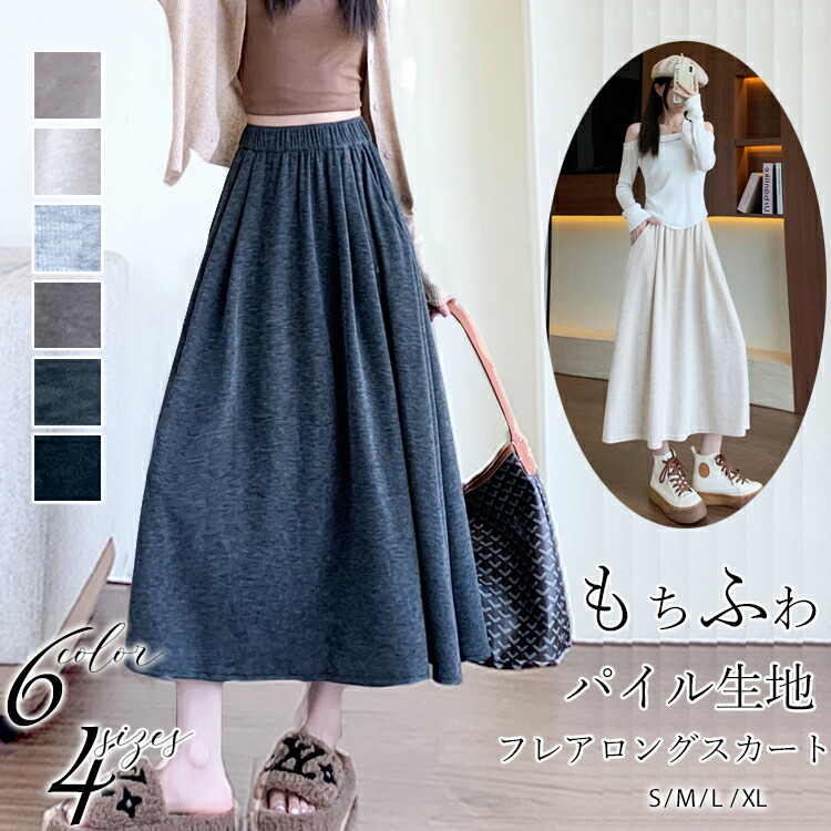パイル生地 フレア ロングスカート レディース 秋冬 ボトムス パイル地 ゆるふわ スカート ロング丈 ミモレ丈 ウエストゴム 楽ちん ゆったり 脚長効果 ふわもち ポケット 上品 オフィス Aライン