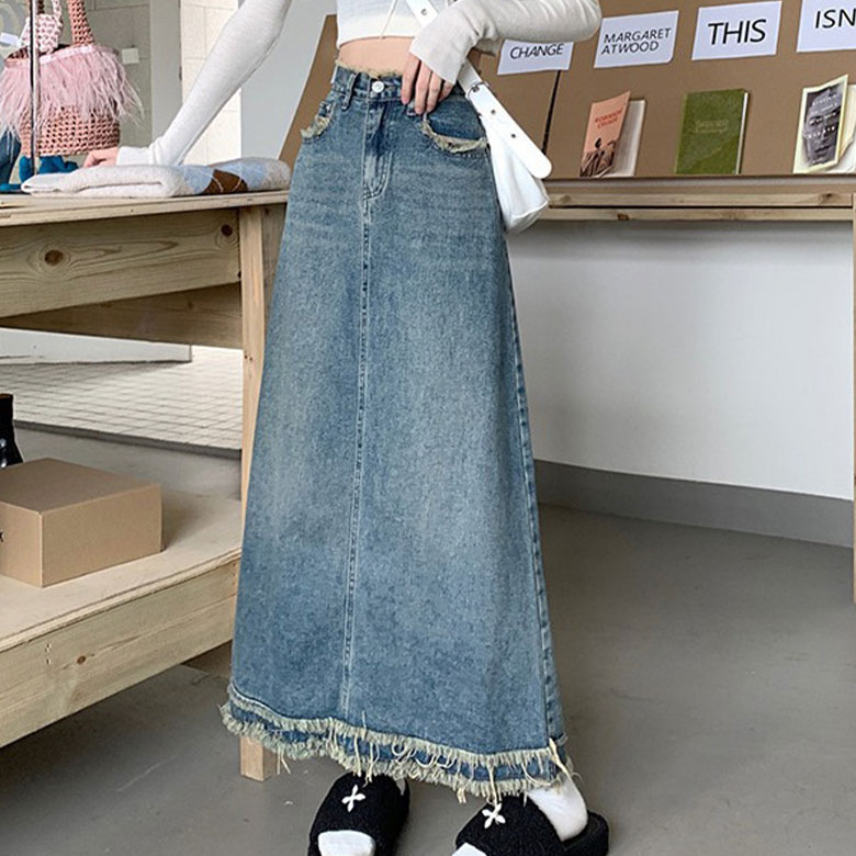 デニムスカート レディース ロングスカート デニムロングスカート 春 秋 Aライン きれいめ カジュアル デニム ヴィンテージ レトロ 裾フリンジ レトロブルー 韓国ファッション お洒落