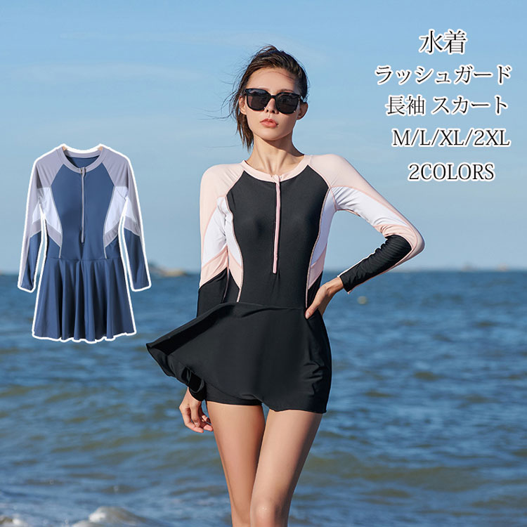 ワンピース 水着 レディース オールインワン ワンピース水着 長袖 ドッキング スカート パッド付き フレア スポーツ水着 フィットネス水着 スイムウェア 女性 日焼け防止 サーフィン ラッシュガード