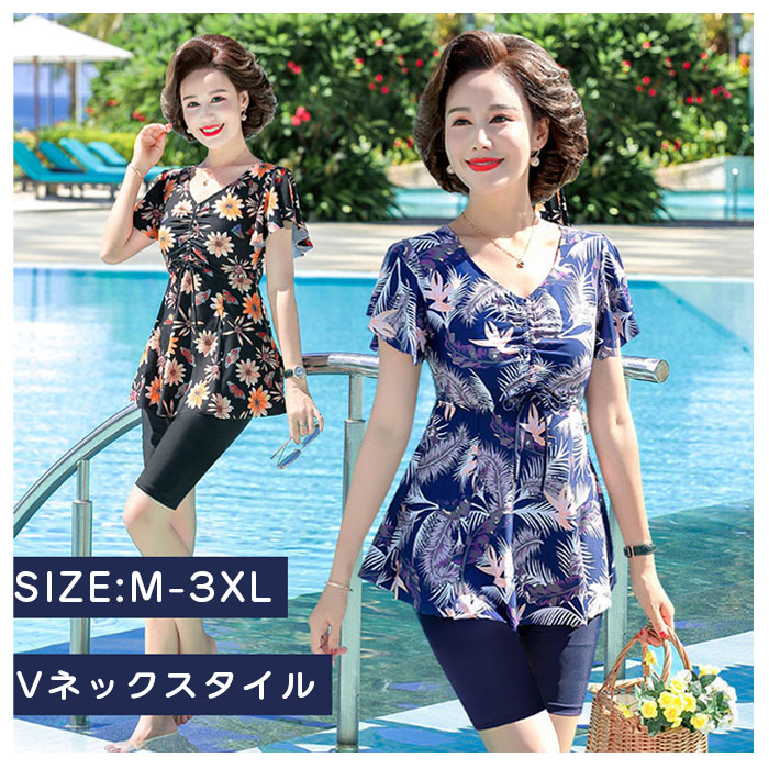 レディース 50代 大きいサイズ 水着 体型カバー セパレート 半袖 花柄 スイムウェア シニア ママ 保守 中高年 リゾート 温泉 ビーチウェア パッド付き ミズギ お母さん