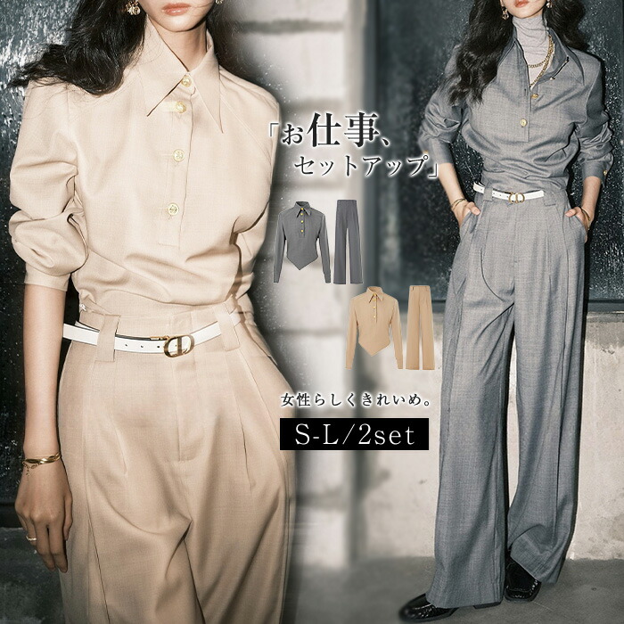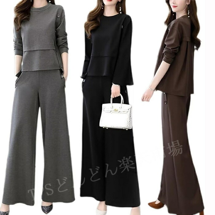 セットアップで統一感を出しつつ、別々でも着まわせるので、使い勝手抜群♪ 無地 大人 可愛い おしゃれ 着痩せ ロングパンツ 体型カバー