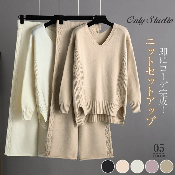 ニット セットアップ レディース リブニット パンツ 2点セット 秋 冬 上下セット ニットパンツ ニットセーター ガウチョパンツ Vネック 無地 ゆったり ワイドパンツ