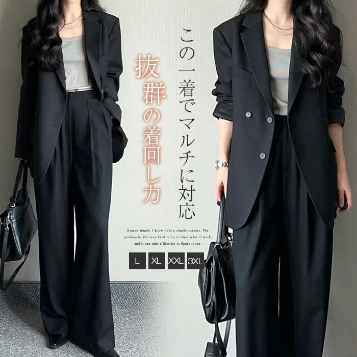 -5細見え 体型カバー スーツジャケット & ワイドパンツ セットアップ 大きいサイズ オールシーズン きれいめ 上品 ゆったり 裏地付き お洒落 オフィスカジュアル 洗濯 送料無料 ♪