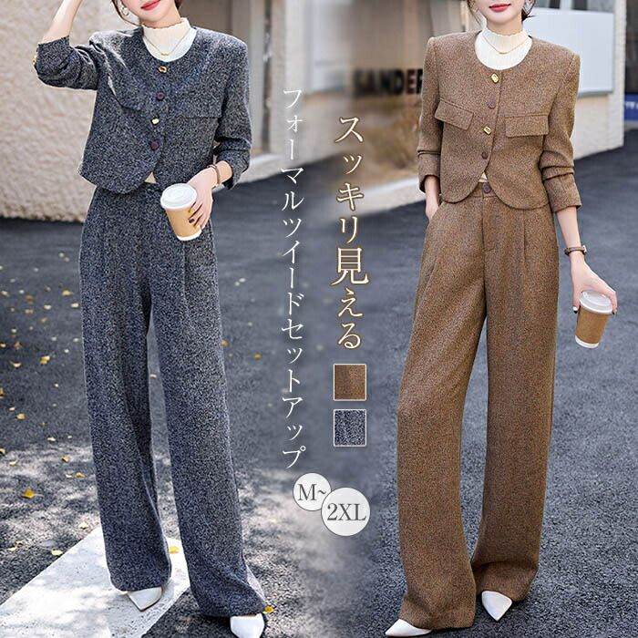 セットアップ レディース 秋冬 ツイードセットアップ フォーマルスーツ ロンパンツ 上下セット きれいめ 華やかおしゃれ 体型カバー ショートジャケット タックパンツ 卒業式 ママ セレモニー 入学式