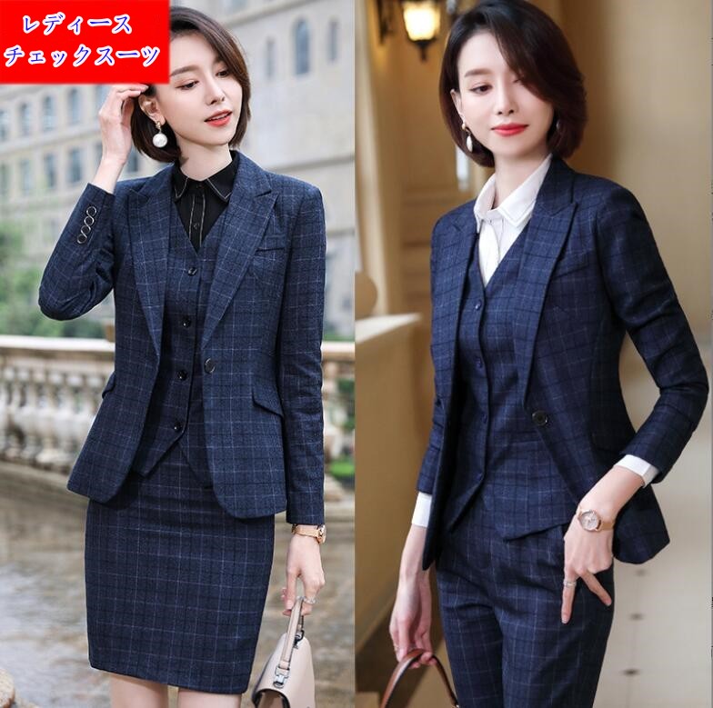 レディース用チェック柄スーツセット春秋用OL通勤定番フォマールスーツフォーマルリクルートスーツレディース通勤職場活躍オフィスパンツスーツ スカートスーツシャツ