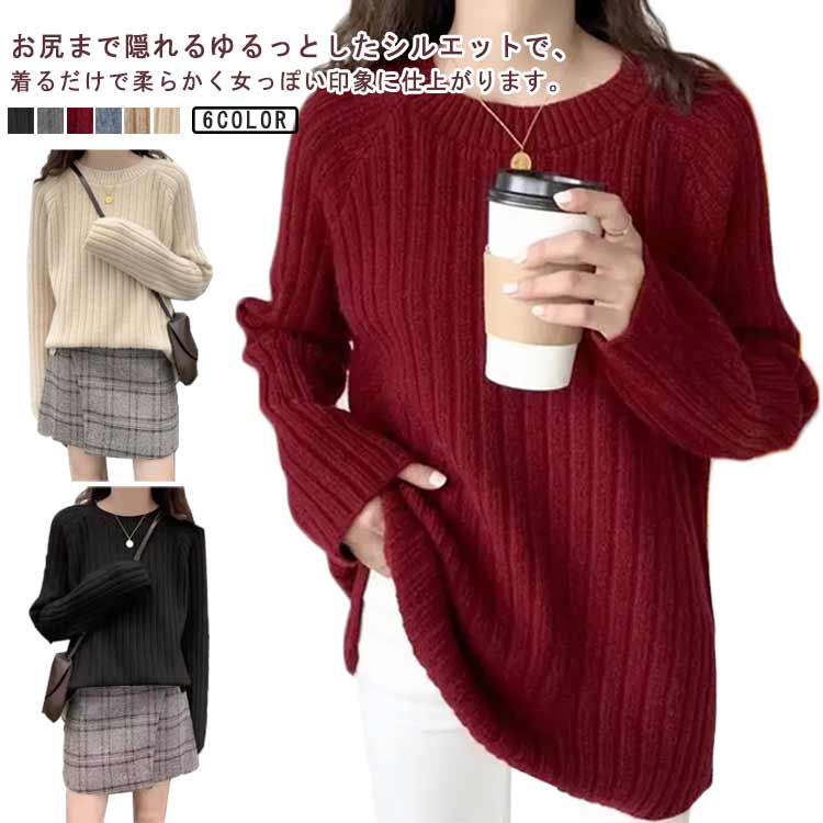 ニット レディース トップス 長袖 ふわふわ セーター 無地 長袖セーター ゆったり クルーネック 大人 体型カバー カジュアル おしゃれ 秋冬 新作 お尻が隠れる