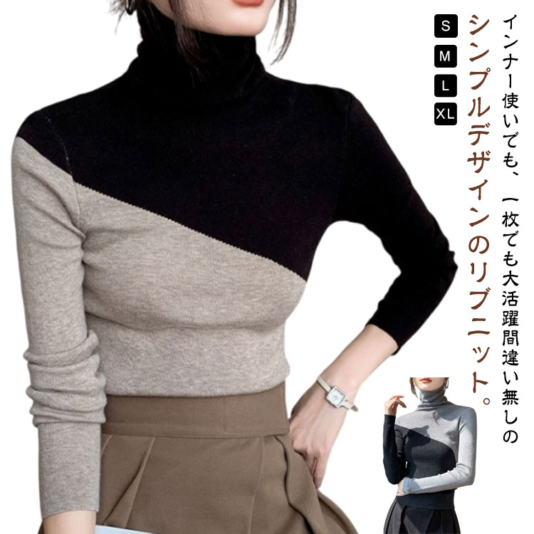 リブニット トップス プルオーバー 配色 タートルネック タイト スリム 細身 ストレッチ 長袖ニット インナー タートルニット