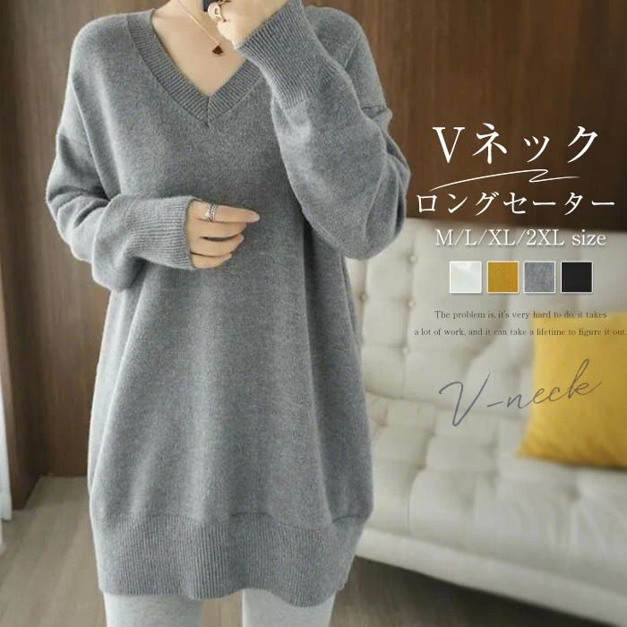 ニットセーター セーター ニット レディース 秋冬 チュニック 長袖 無地 Vネック ミドル丈 トップス カットソー ニットウエア プルオーバー オーバーサイズ 体型カバー 暖か 大人可愛い ゆったり