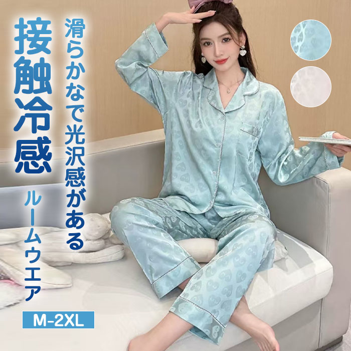 パジャマ レディース 春 長袖 前開き パンツ テーラー襟 サテン 光沢 ツルツ 滑らか シルクタッチ 春秋 春夏 ルームウェア 寝巻 部屋着 可愛い ナイトウエア 上下セット 襟付 入院