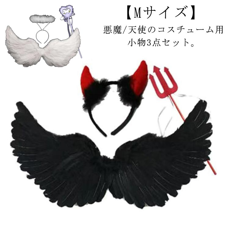 3点セット 悪魔 天使 ハロウイン コスチューム 悪魔の羽 フェザー 翼 羽根 エンジェル 大人 子供 コスプレ デビル 衣装 パーツ パーティー小物 妖精 悪魔の棒 仮装 ハローウィン カチューシャ