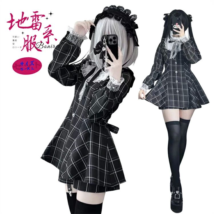 ワンピース レディース ブラック レース リボン フリル 長袖 チェック柄 地雷系 ロリータファッション 甘辛ミックス ゴシックドレス 街コーデ 病みかわいい