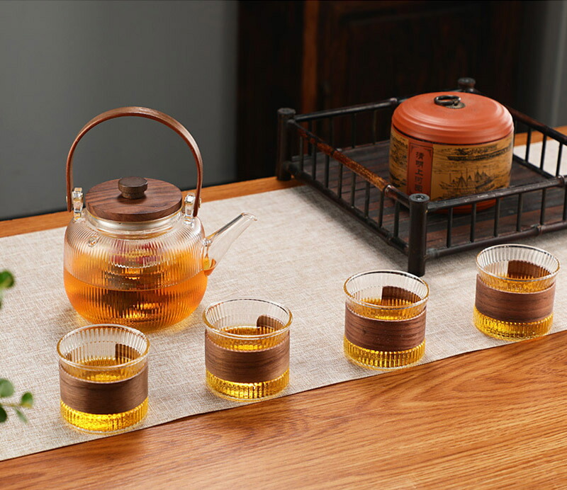 耐熱ガラス ティーポット 900ml 茶こし付き ガラス製ポット 木製持ち手 茶器 縦縞硝子急須 ティーカップ4個 紅茶ポット フルーツティー 花茶 工芸茶 ハーフティー ガラス急須 健康茶器 直 に