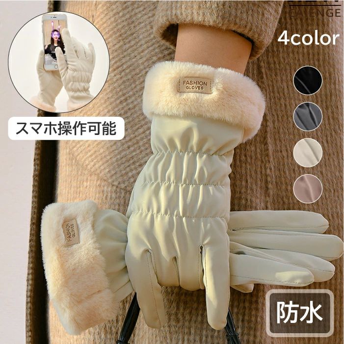 手ぶくろ レディース 裏起毛 防寒 防水 防風 フェイク革 スマホ対応 暖かい グローブ タッチパネル あったか モコモコ スマホ 手袋 通勤 自転車 アウトドア おしゃれ キャメル 黒 グレ ピンク