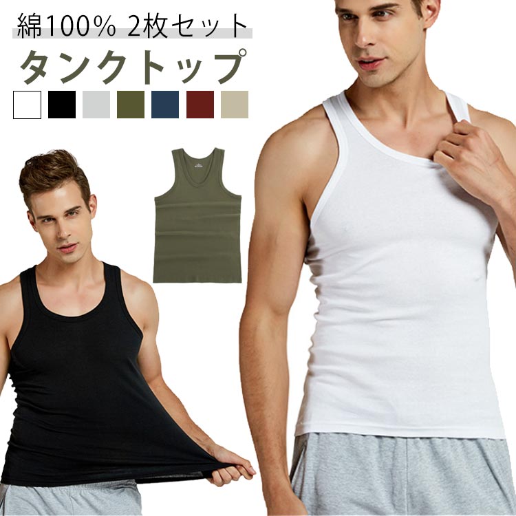 シンプル メンズ 定番 綿100% インナーシャツ 肌着 下着 リブ ノースリーブ 2枚組 紳士 オールシーズン トレーニングウェア ランニングウェア タンクトップ フィットネス