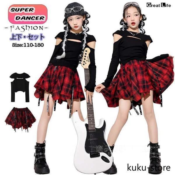 キッズダンス衣装 セットアップ 赤 へそ出し スカート チェック柄 ダンス衣装 トップス 黒 k-pop 衣装 ベスト 長袖 韓国 ダンス