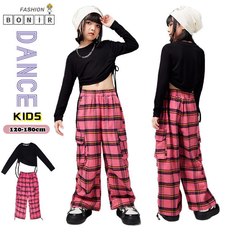 ダンス衣装 キッズ セットアップ 女の子 チーム衣装 練習着 上下セット へそ出し トップス チェックパンツ チアガール ジャズ K-POP ヒップホップ hiphop ステージ衣装 演出服 子供服