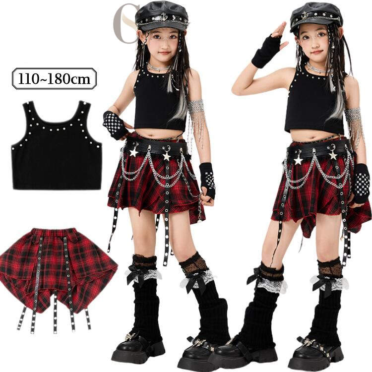 キッズダンス 衣装 女の子 黒 ステージ衣装 袖なし へそ出し 赤チェックスカート 子供 ジャズダンス チアガール ダンス衣装 演出服 韓国 y2k k-pop ダンスウェア jazz HI アイドル