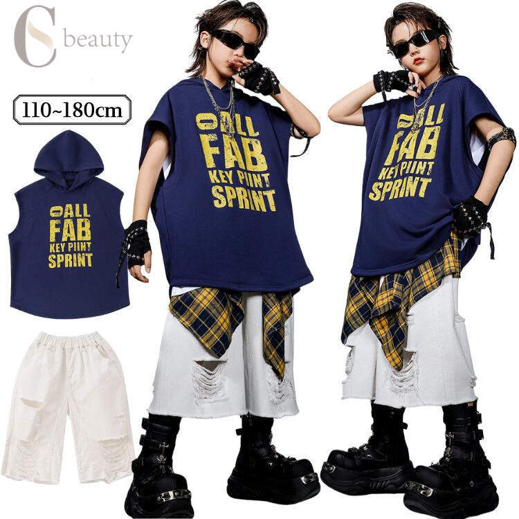 紺色 ダンス衣装 キッズダンス かっこいい 白 ダメージ ハーフパンツ セットアップ ステージ衣装 日常 女の子 男の子 キッズダンス衣装 袖なし 上下 キッズ ファッション ガー 演出服