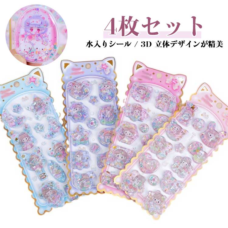 4枚セット ウォーターシール 水入りシール 水揺れシール ぷっくりシール ぷくぷくシール 3D立体 ごほうびシール ビーズ入り 可愛い デコシール 女の子 幼稚園 手帳 ノート 小学生