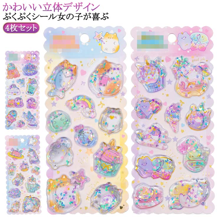 4枚入り ウォーターシール ぷっくりシール ぷくぷくシール 3D 立体シール シール帳 可愛い シール ご褒美シール 装飾用 DIY用 女の子 小学生 ノート ステッカーデコ 手作り 3Dステッ 手帳