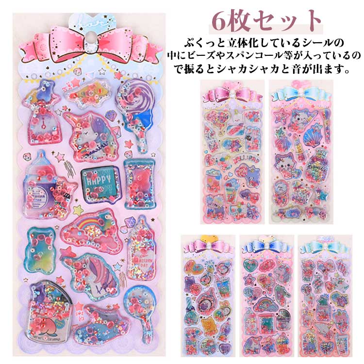 3D立体 ウォーターシール 立体シール 6枚セット 可愛い ぷっくりシール ぷくぷくシール 手芸用品 手帳用 小学生 女の子 シール帳 ノート 誕生日 クリスマス ご褒美シール カラフル