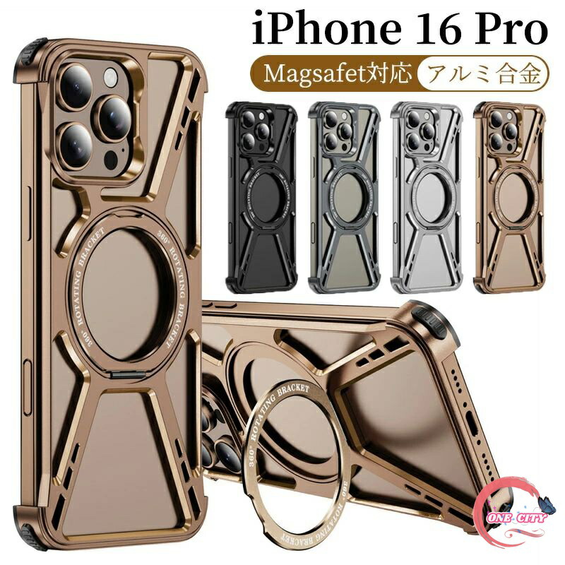 iPhone 16 Pro フレームレスケース Ppro max Plus 16用 magsafe対応 メタル アルミ合金 アルミニウム 360°回転 超軽量 中空放熱 i キックスタンド