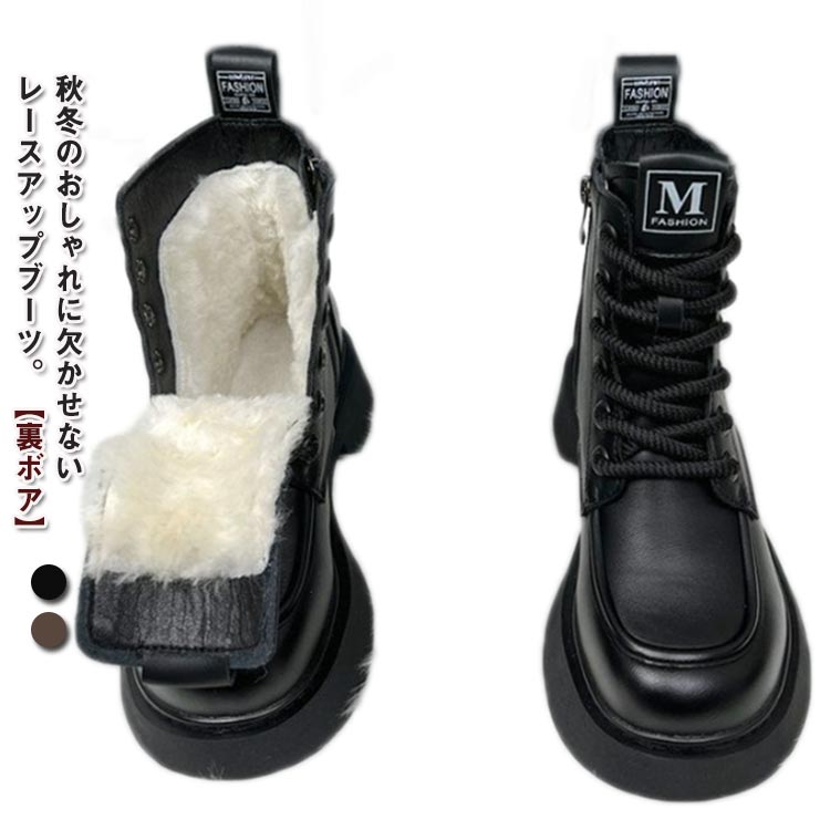 レースアップブーツ 編み上げブーツ サイドファスナー 裏ボア 裏起毛 極暖 あったか レザー ローヒール 厚底 ブーツ