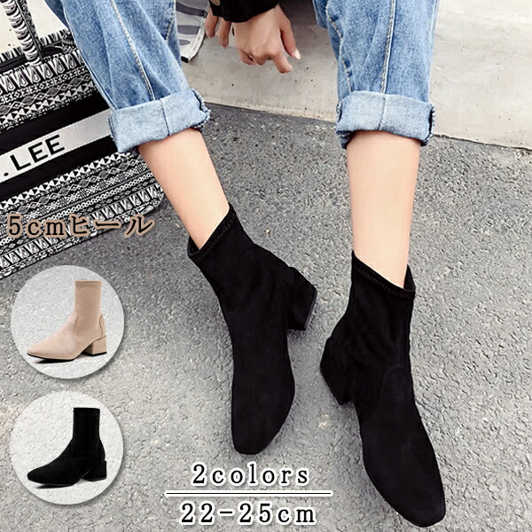 ヒールブーツ ショートブーツ レディース 5cmヒール チャンキーヒール ストレッチブーツ シンプル 太ヒール オシャレ 上品 カジュアル 滑らない サマーブーツ 2色 レディースブーツ 日常ブーツ