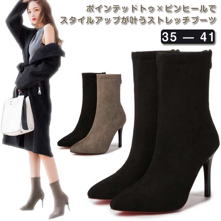 ピンヒール ショートブーツ ブーティ ストレッチ スエード調 6cmヒール バックファスナー 美脚 ポインテッドトゥ 秋 レッドソール ハイヒール 疲れない 歩きやすい