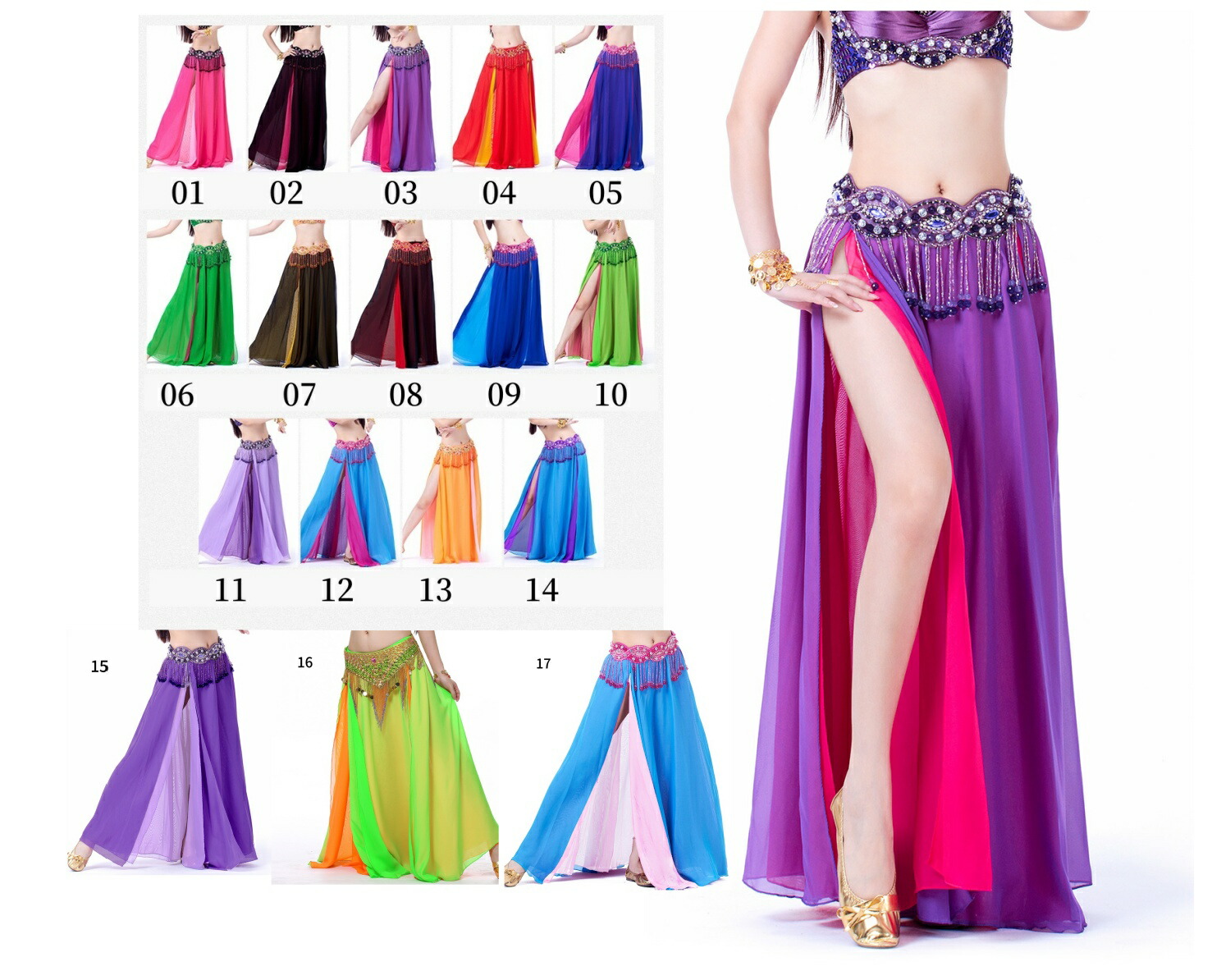 ベリーダンス スカート セクシーダンス へそ出し 両側スリットシフォンスカート ステージ衣装 ダンスレッスン着 練習着 団体服 コンクール 舞台衣装 余興 忘年会 ボトムス レディース モダン 17色