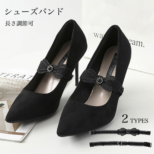 シューズバンド お洒落 ストレッチ レディース シューズストラップ 長さ調節可 パンプスベルト ゴム ブラックレース 蝶結び リボン パンプスストラップ 脱げ防止 靴 伸縮 ストラップ 装着簡 バンド