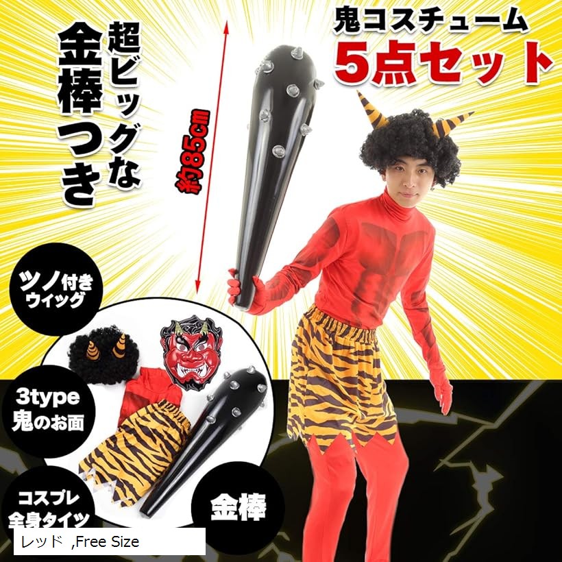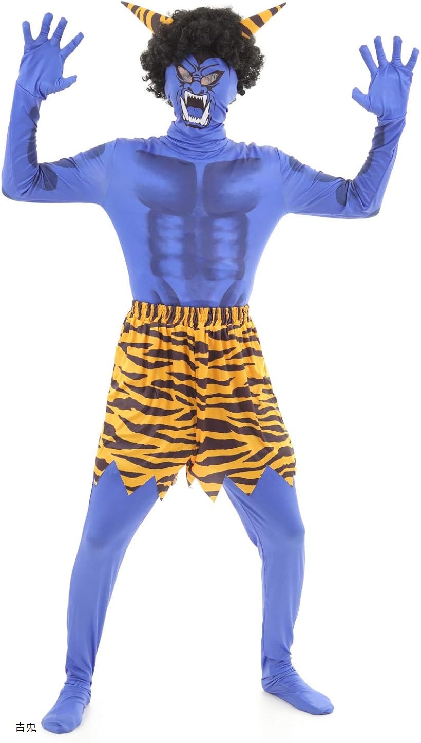 肌見えゼロ 節分用衣装 鬼コスチューム 5点フルセット 全身タイツ ウィッグ付き 棍棒 虎柄パンツ お面