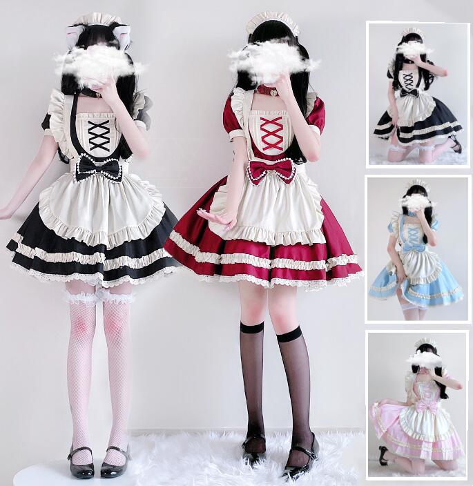 メイド服 膝丈 ロリータワンピース 半袖 5点セット 女性 ハロウィン コスプレ衣装 スカラップ ドレス 学園祭 文化祭 イベント 撮影衣装 コスチューム ピンク ブルー ワイン ブラック