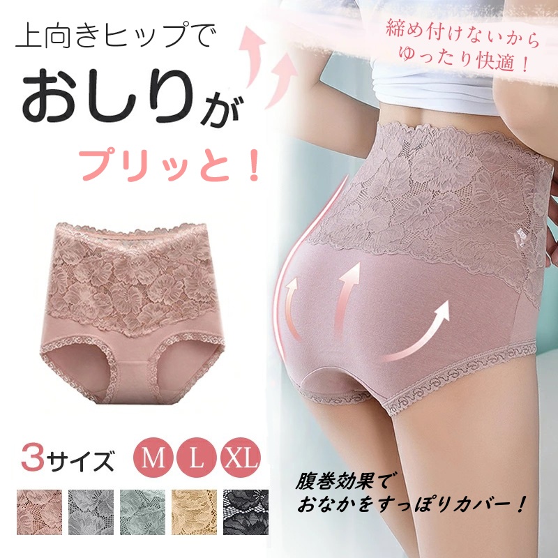 ヒップアップ効果抜群のハイウエストショーツ。深履きでお腹をしっかり包み込み、レースとコットン素材で肌に優しい。伸縮性もあり、体型カバーもバッチリ。花柄レースが女性らしさを引き立て、旅行や母の日にもぴったり!