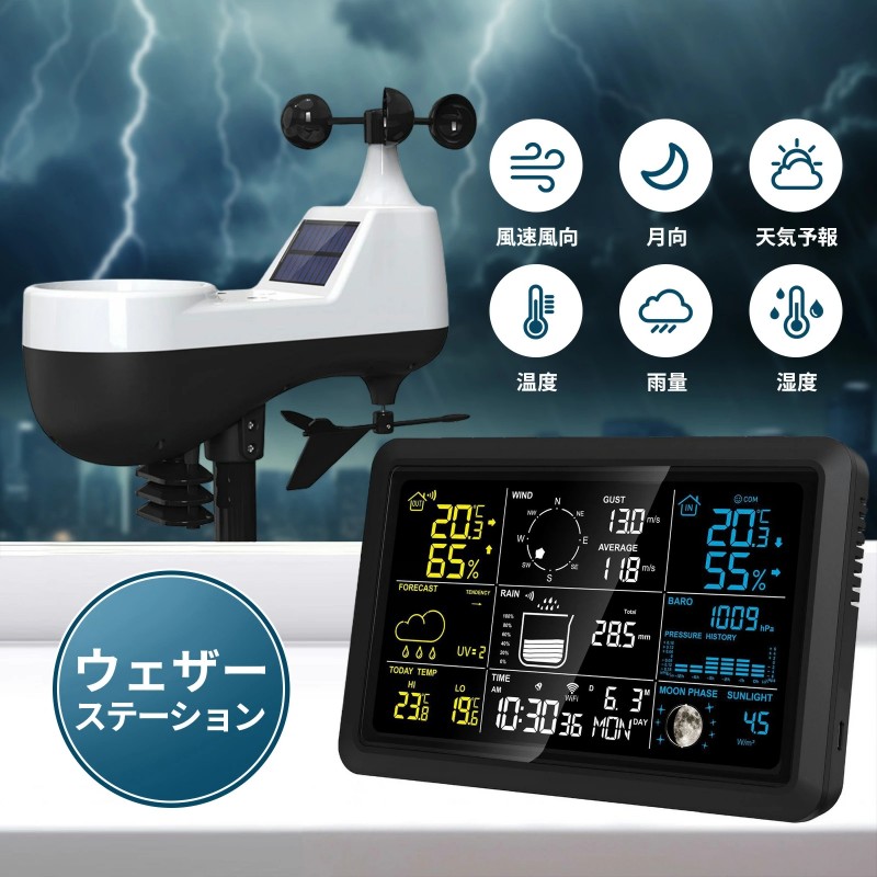 ウェザーステーション 気象観測器 気象計 ワイヤレス クラウド 風速計 雨量計 気圧計 UV計 温度計 湿度計 大画面 スマート 多機能 iPhone ソーラー WS5107 スマホ