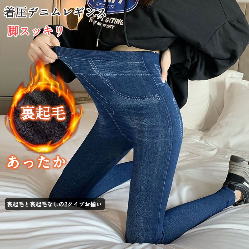 裏起毛と裏起毛なしから選べる 美脚 着圧デニム レギンスパンツ あったか 裏起毛レギンス インナー 美脚 スキニーデニム デニムパンツ オールシーズン